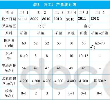 表2 可以年出,選用PFMS2800礦渣立磨的廠家,其產量均達到并超過了設計產量。工廠1的產量達到54t/h,年運轉率達到80%。工廠6在礦渣中添加了爐渣的混合材,爐渣量達到20%,投料量達到60-70t/h,有效地降低了成本。