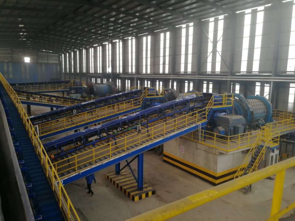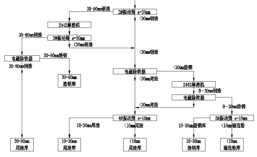 通過(guò)熱悶作業(yè)消除、粉化后的鋼渣,通過(guò)履帶式挖掘機(jī)將熱悶裝置內(nèi)的鋼渣取出放入儲(chǔ)料場(chǎng)儲(chǔ)渣槽里進(jìn)行晾曬和粉化。經(jīng)晾曬和粉化好的鋼渣通過(guò)抓斗起重機(jī)分別抓運(yùn)至儲(chǔ)料場(chǎng)中的液壓傾翻格篩上,大于200mm粒級(jí)的鋼渣落入渣槽由裝載機(jī)運(yùn)至落錘處進(jìn)行處理剝離出渣鋼,用電磁吸盤將渣鋼吸出,剩余鋼渣返回傾翻格篩進(jìn)入加工生產(chǎn)線。小于200mm粒級(jí)的鋼渣進(jìn)入篩下料倉(cāng),由振動(dòng)給料機(jī)將物料均勻送給1#膠帶輸送機(jī),由1#膠帶機(jī)將鋼渣送入磁選-提純加工線。該轉(zhuǎn)爐鋼渣的磁選-提純加工線的設(shè)計(jì),考慮生產(chǎn)線的機(jī)動(dòng)性,即當(dāng)工藝線設(shè)備檢修時(shí)確保連續(xù)生產(chǎn),本設(shè)計(jì)采用兩條加工線并列生產(chǎn)。每條線均包括有破碎、篩分、磁選、提純加工等工藝環(huán)節(jié)。由1#膠帶機(jī)將物料送入加工線,首先在入線的輸送機(jī)上設(shè)有懸掛有電磁除鐵器,將大渣鋼選出落入渣鋼槽;鋼渣送入1#振動(dòng)篩(e=80mm)進(jìn)行分級(jí)。80mm以上的篩上鋼渣直接進(jìn)入PEY600×900液壓顎式破碎機(jī)進(jìn)行破碎,破碎至80mm以下的鋼渣與篩下的鋼渣一并經(jīng)2#膠帶輸送機(jī)送至2#振動(dòng)篩分級(jí)。2#振動(dòng)篩(e=30mm)篩上物(>30mm的鋼渣)經(jīng)3#膠帶機(jī)和振動(dòng)給料機(jī)送進(jìn)1#棒磨機(jī)進(jìn)行破碎和提純處理,棒磨機(jī)排出后經(jīng)4#、5#膠帶機(jī)送入3#振動(dòng)篩(e=30mm)進(jìn)行分級(jí),>30mm的鋼渣經(jīng)膠帶機(jī)送大渣庫(kù)由磁選機(jī)將渣鋼和尾渣分離開(kāi)來(lái)分別入庫(kù)。2#振動(dòng)篩和3#振動(dòng)篩的篩下物均為<30mm鋼渣,由膠帶機(jī)送入1#單磁選機(jī)將磁性物料分離出來(lái),由膠帶機(jī)送進(jìn)磨頭倉(cāng),由計(jì)量秤、膠帶機(jī)、振動(dòng)給料機(jī)等將磁性物料均勻送入2#棒磨機(jī)進(jìn)行提純處理;經(jīng)2#棒磨機(jī)進(jìn)行提純后的鋼渣由膠帶機(jī)送入2#單磁選機(jī)分離出渣鋼由膠帶機(jī)送入4#振動(dòng)篩(e=10mm)進(jìn)行篩分,根據(jù)產(chǎn)品的不同用途分出渣鋼(10-30mm)和磁選粉(<10mm)分別入庫(kù);經(jīng)1#、2#單磁選機(jī)排出的非磁性物料統(tǒng)稱為尾渣,均由膠帶機(jī)送入5#振動(dòng)篩(e=10mm)進(jìn)行篩分,分級(jí)為>10mm的尾渣和<10mm的尾渣分別進(jìn)入尾渣庫(kù)。