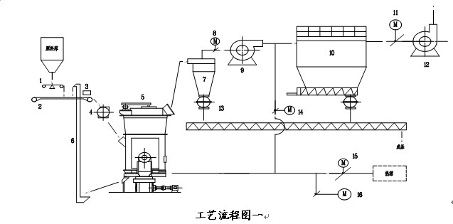1.電子皮帶稱 2.皮帶輸送機(jī) 3.板鏈提升機(jī) 4.回轉(zhuǎn)鎖風(fēng)喂料機(jī) 5.HRM型立式磨 6.氣箱脈沖收塵器 7.立磨排風(fēng)機(jī) 8. 循環(huán)風(fēng)碟閥 9.冷風(fēng)蝶閥 10.熱風(fēng)蝶閥 11.電動(dòng)除鐵器