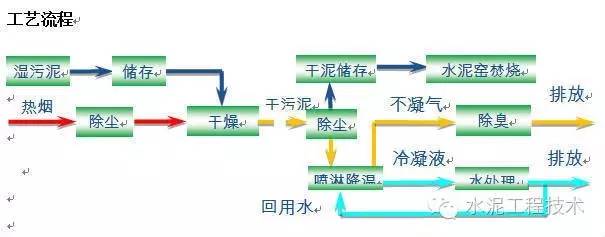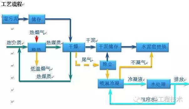 利用水泥生產(chǎn)過程中的廢熱煙氣作為熱源,通過換熱裝置將熱量轉(zhuǎn)換給載熱媒質(zhì)。在干化機內(nèi)被載熱媒質(zhì)加熱脫水后,干污泥送入水泥窯焚燒處置。經(jīng)噴淋降溫后的尾氣與輸送儲存過程中的臭氣一起直接入窯焚燒,無臭氣外泄。冷凝液經(jīng)處理后,循環(huán)使用或排放。特點是載熱媒質(zhì)不與濕污泥直接接觸,尾氣處理工藝簡單。工藝操作靈活,能夠適應(yīng)不同進泥含水率,出干燥機污泥含水率可在10%-30%調(diào)整。