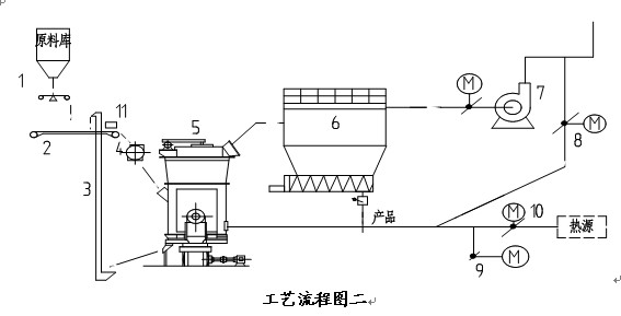 1.電子皮帶稱 2.皮帶輸送機(jī) 3.板鏈提升機(jī) 4.回轉(zhuǎn)鎖風(fēng)喂料機(jī) 5.HRM型立式磨 6.氣箱脈沖收塵器 7.立磨排風(fēng)機(jī) 8. 循環(huán)風(fēng)碟閥 9.冷風(fēng)蝶閥 10.熱風(fēng)蝶閥 11.電動(dòng)除鐵器